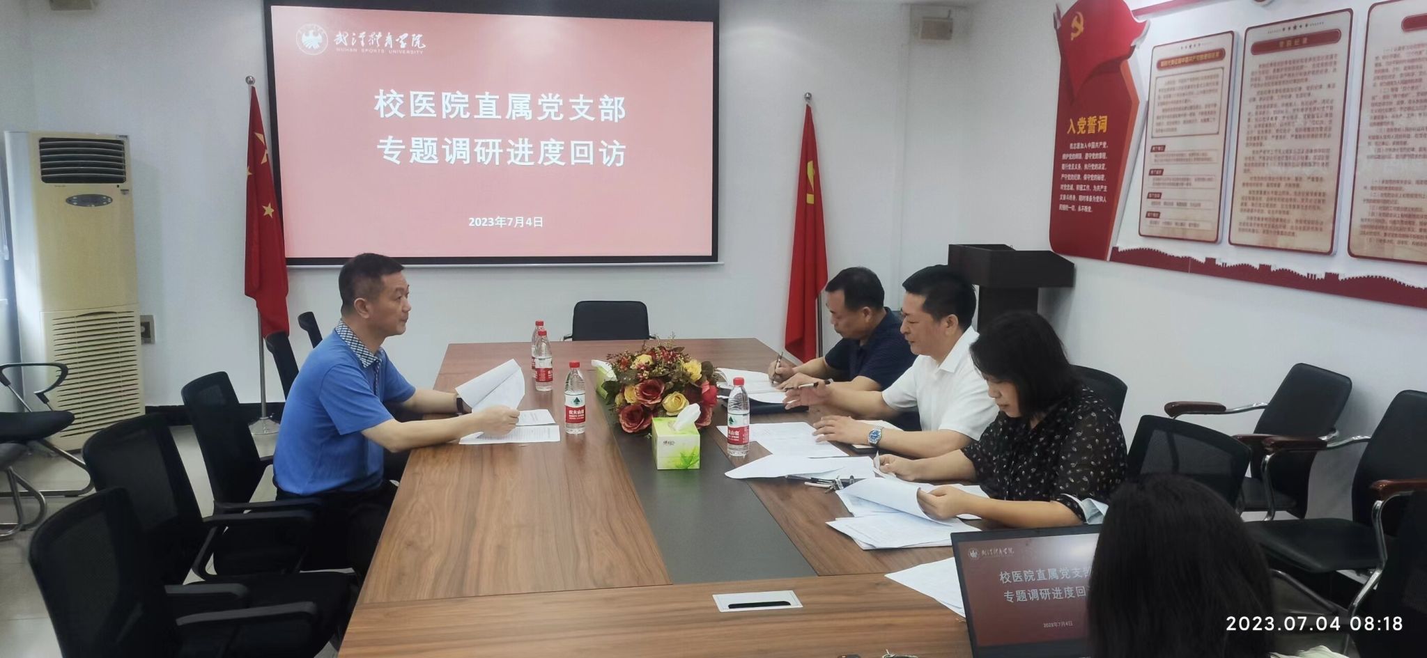 7月4日上午,学校党委常委、副校长朱磊来校医院开展主题教育回访调研。督查前期专题调研报告会上提出的反馈意见整改落实情况,校医院直属党支部书记夏数数、院长李绪贵以及校医院中层干部代表参加会议。
