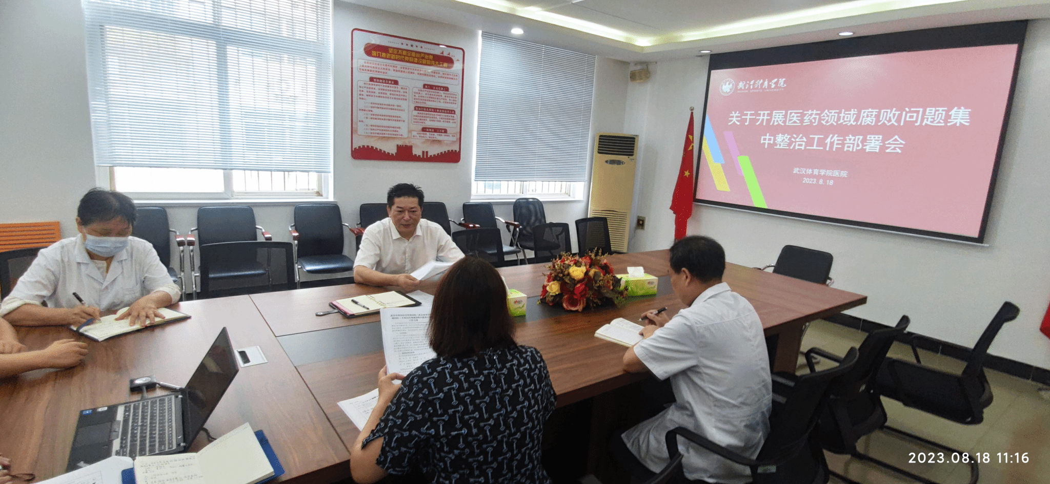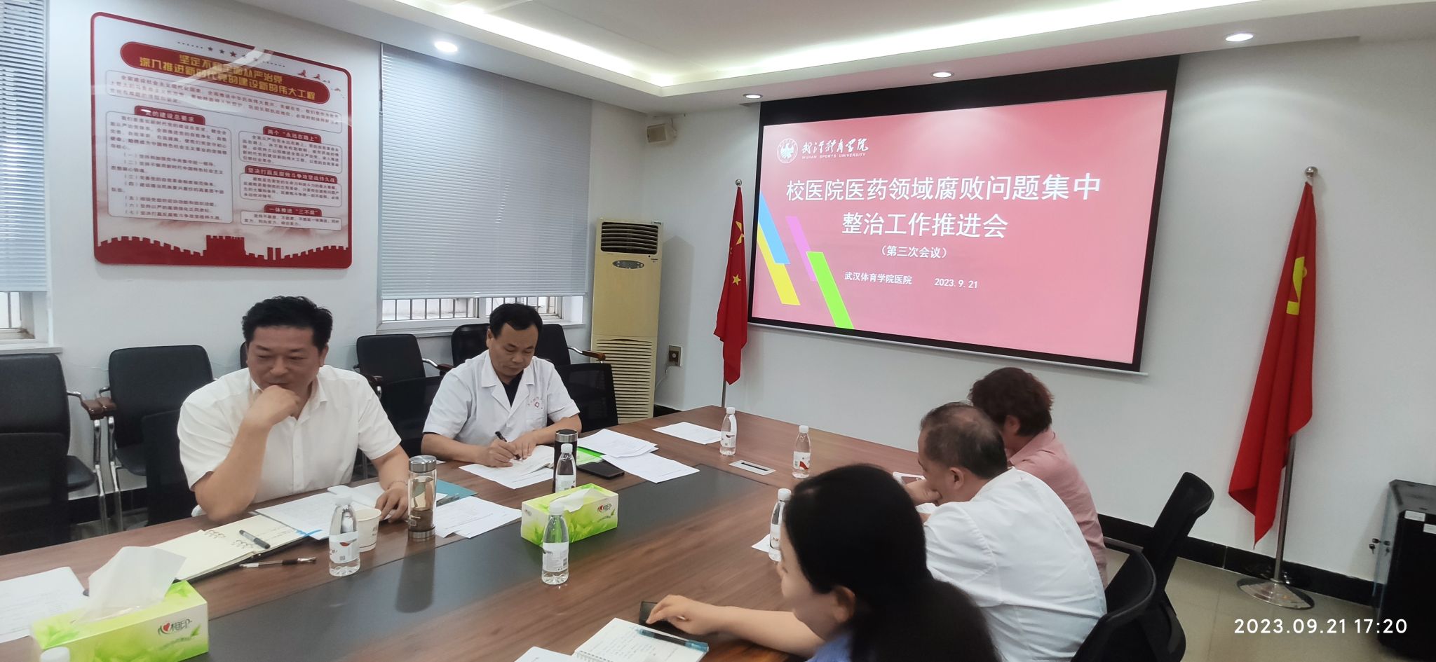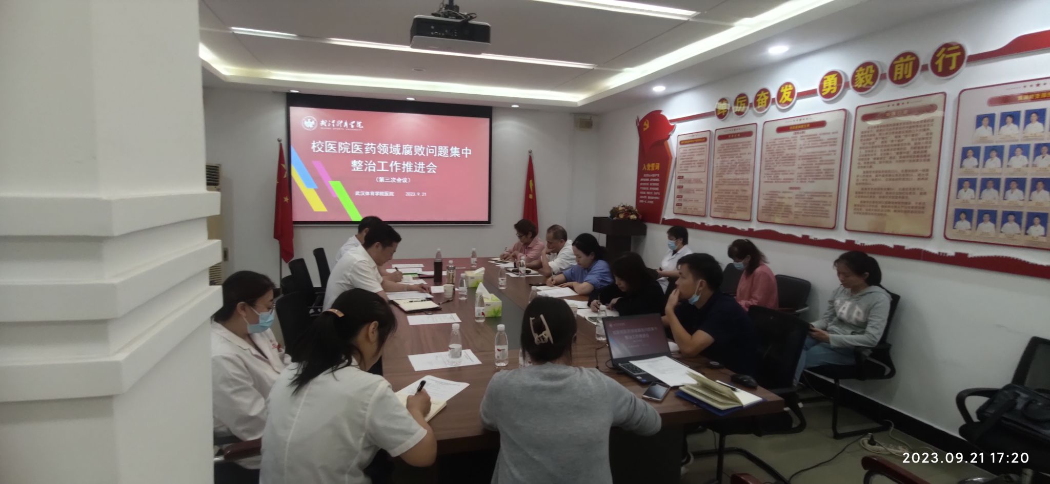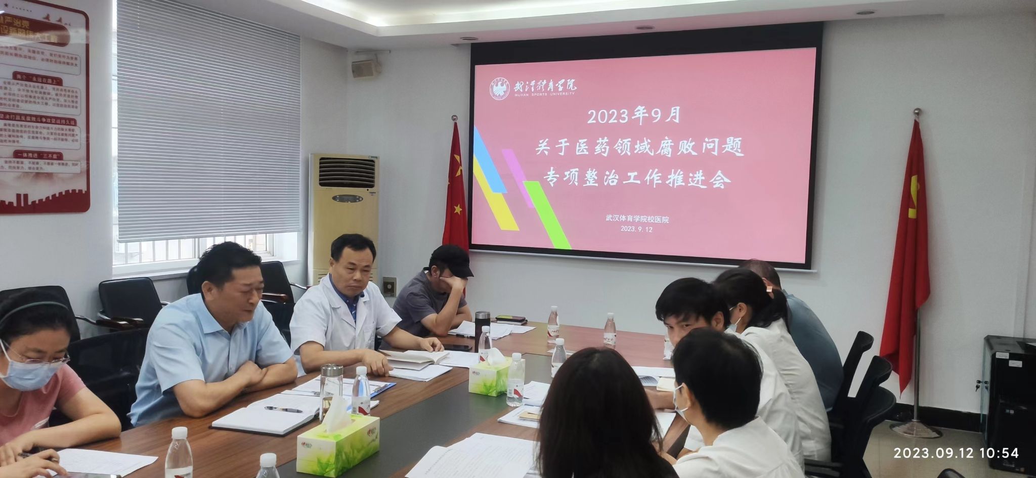 9月12日,医院召开医药领域腐败问题专项整治工作推进会(第二次会议),传达了《关于印发<武汉市洪山区医药领域腐败问题集中整治工作实施方案>的通知》《关于印发<武汉体育学院关于开展医药领域腐败问题集中整治工作方案>的通知》(洪卫[2023]20号、武体院发〔2023〕53号)等文件精神,并对下一阶段医药领域腐败问题集中整治工作进行了安排部署。
